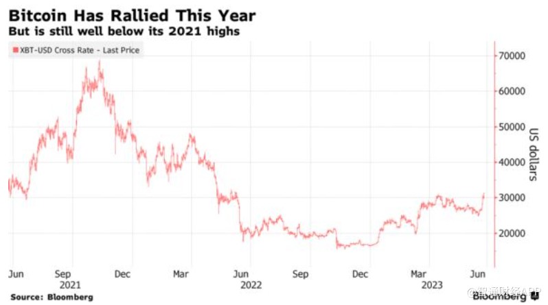 比特币价格超过了2023年的峰值31,013美元,周五触及31,410美元,为2022年6月以来的最高水平。自今年年初以来,比特币上涨了近90%,但仍比其历史最高点的近69,000美元低50%以上。其他加密货币也紧随其后,以太坊也出现了反弹。