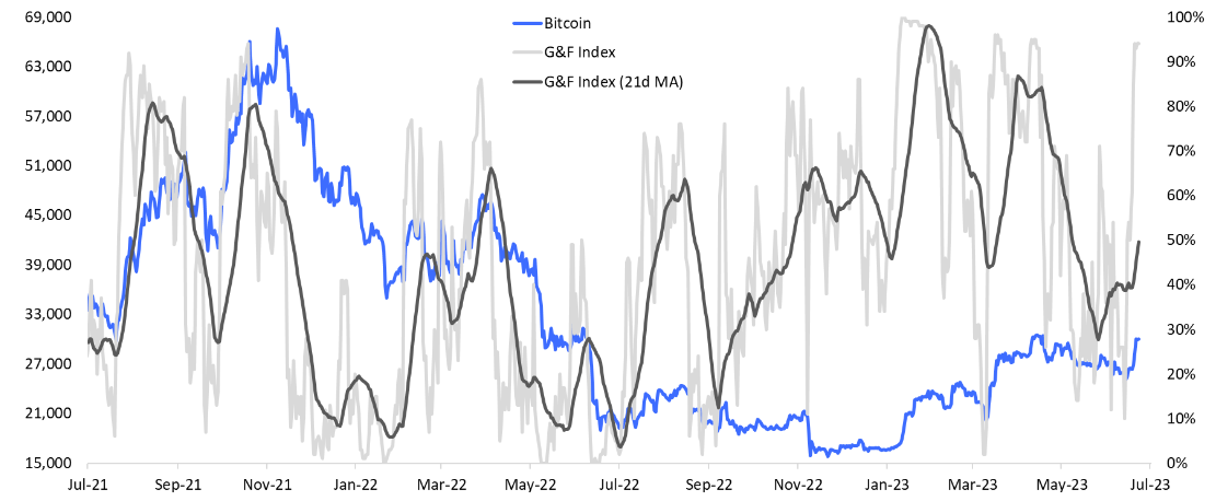 从历史上看,高于90%的指数与比特币价格的临时顶部相吻合,低于10%的指数预示着价格上涨。