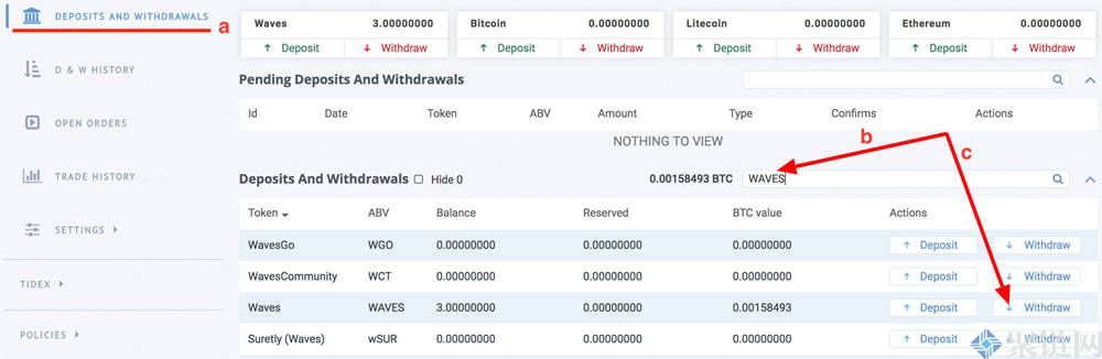 b)找到您想提取的加密货币。例如,我将选择WAVES。
