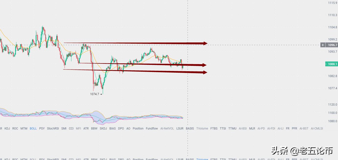 同样我们来看一下以太坊,这两天的走势相对来说就稍微弱那么一点点,以太坊看一下上沿受阻到前期的一个区间顶部,下沿的话我们需要关注前期的一些支撑区域就是区间底部了,所以说向下的话1080是有一个小的一个支撑位,在向下的话前期的这个低点颈线位置他很关键,哪整体而言他也是同样的操作思路。