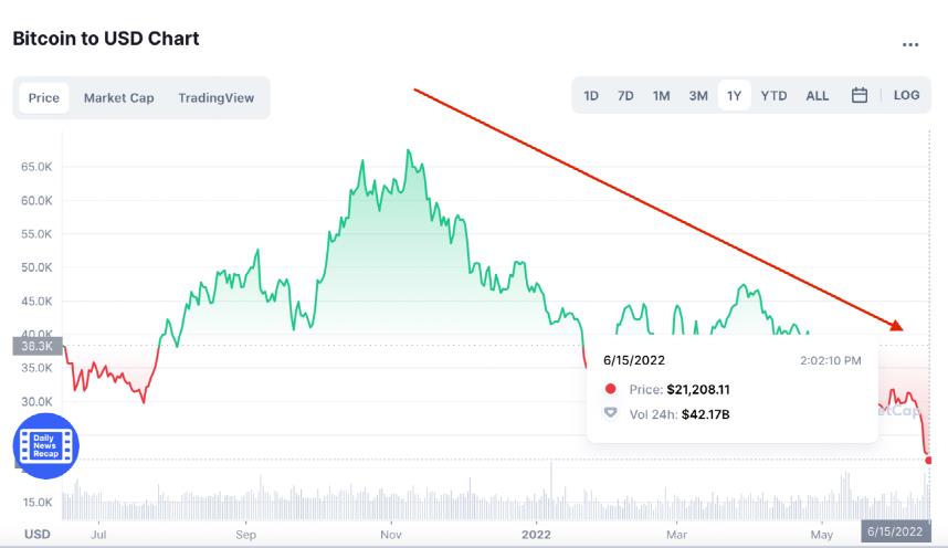6月14号比特币再次上演高台跳水,单日暴跌近11%,一度跌破2万美元历史关口,创下了自2020年12月以来最低水平。要知道的是在2021年的11月,比特币可是创下了6.9万美元的历史巅峰啊。