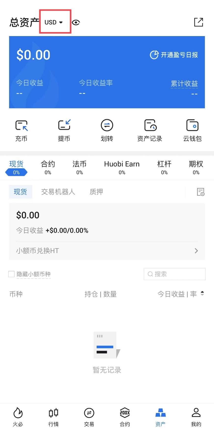 选择您想要查看的资产类型(以USD为例),之后您可以在本页面查看资产。