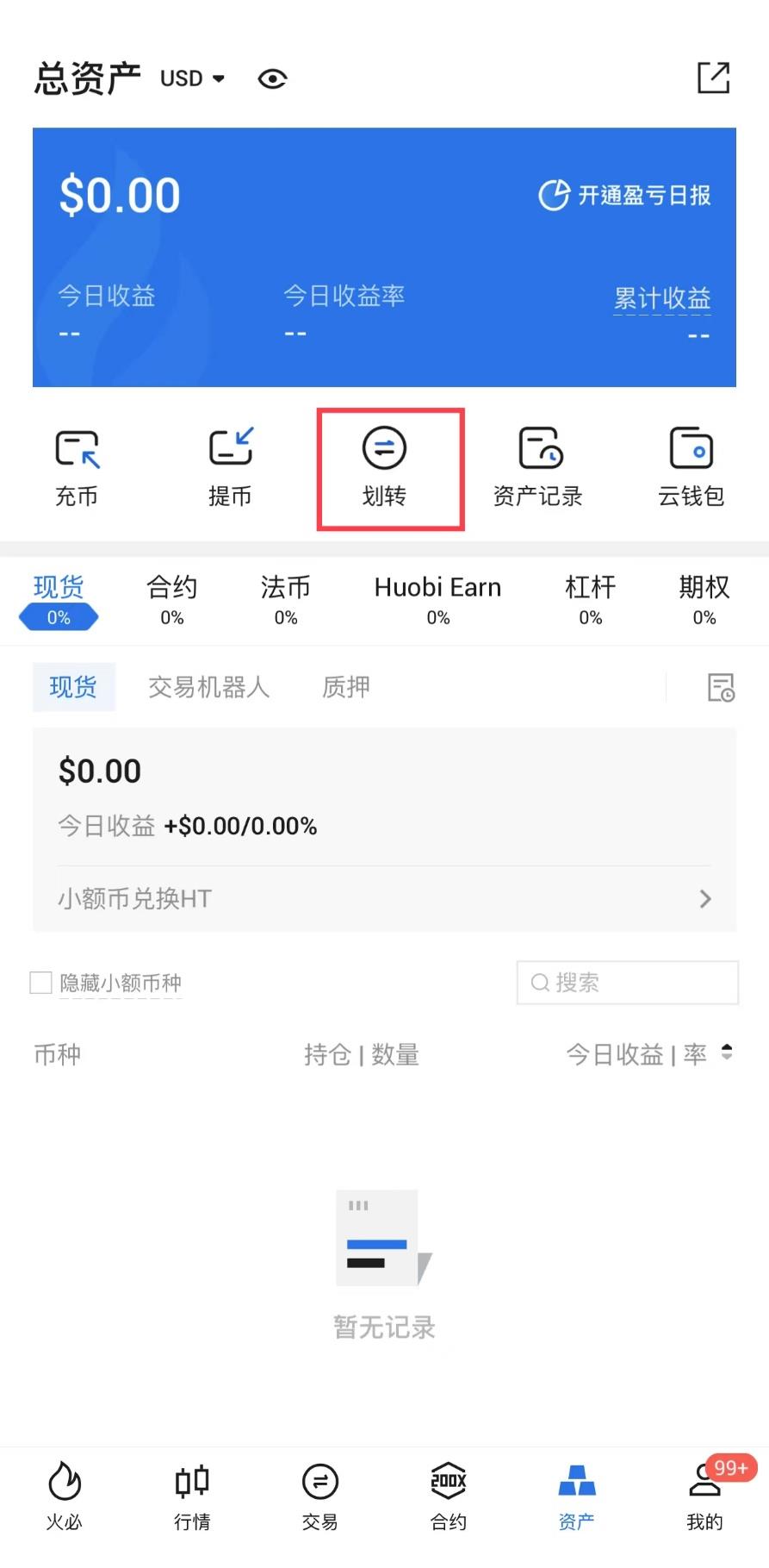 打开火必APP,点击右下角[资产]。