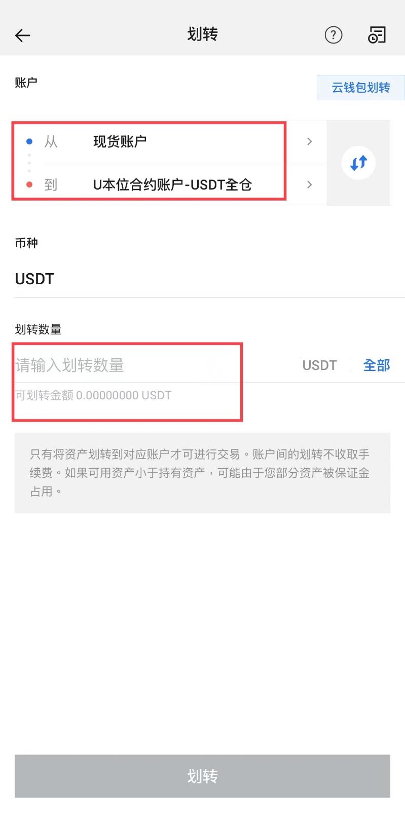 之后,请根据您的需求选择账户类型,并填写划转数量,随后点击划转。