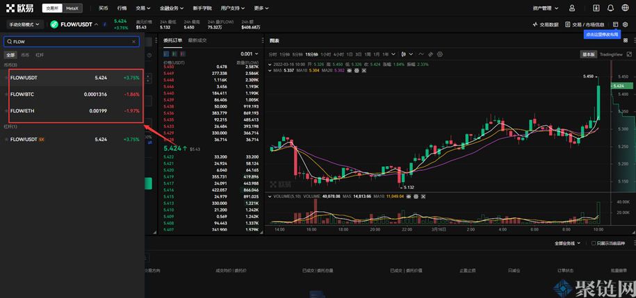 2、在交易对中输入FLOW,就会出现欧易交易所支持的相关交易对