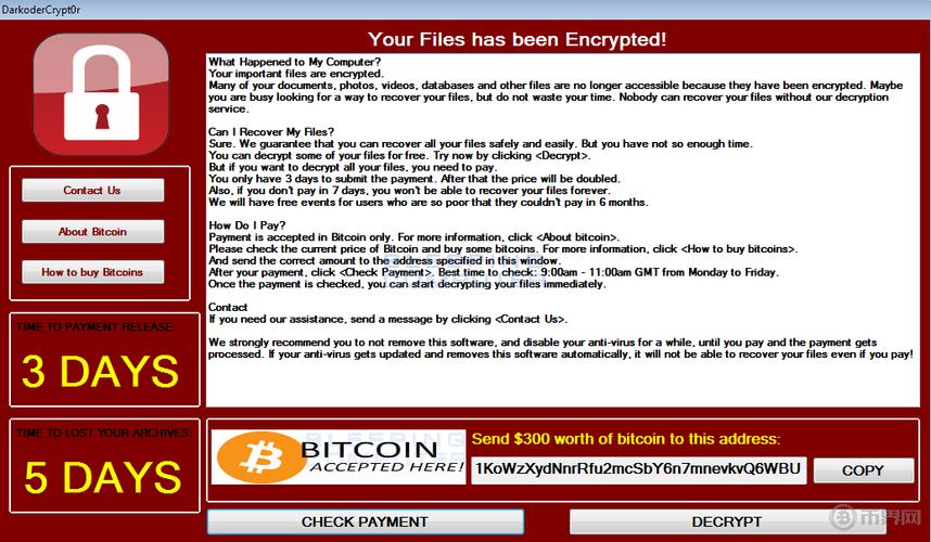这种病毒会把用户的文件加密,并要求支付比特币,以解除锁定。用户的文件可能会被永久锁定,导致无法访问,因此,用户在收到这种病毒之后,最好不要支付比特币,以免被骗。