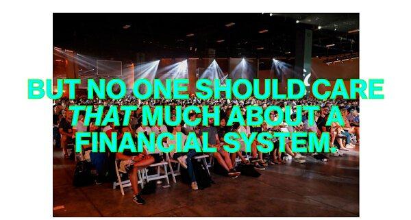 金融系统是一系列数据库。这是一种对有形物品的索赔进行洗牌的方法;它是现实世界的附属品。如果一个金融系统能让农民更容易种植食物,让家庭更容易拥有房屋和企业来制作出色的电脑游戏,如果它有助于在现实生活中创造和分配财富。如果一个金融系统交易抽象的债权以致富于交易者但不帮助其他任何人,那么它就是糟糕的。