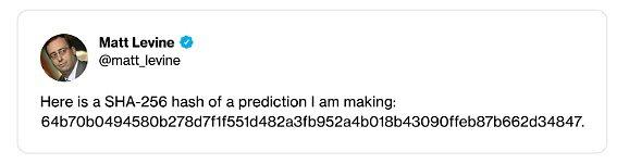 Matt Levine 的推文“这是我正在做的预测的 SHA-256 哈希:64b70b0494580b278d7f1f551d482a3fb952a4b018b43090ffeb87b662d34847。”
