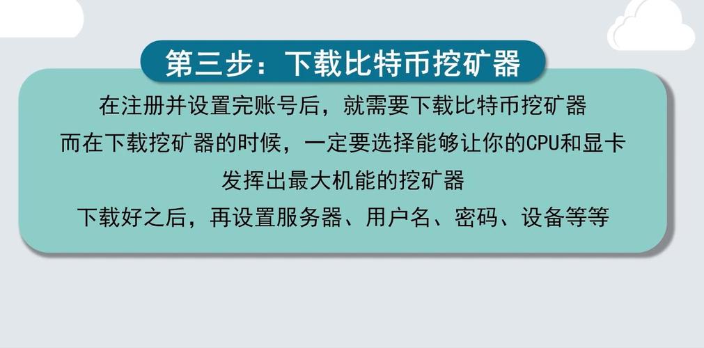 安装挖矿软件:第三步是安装比特币挖矿软件,比特币挖矿软件可以帮助挖矿者把比特币网络的交易记录到区块链中,从而获得比特币奖励。