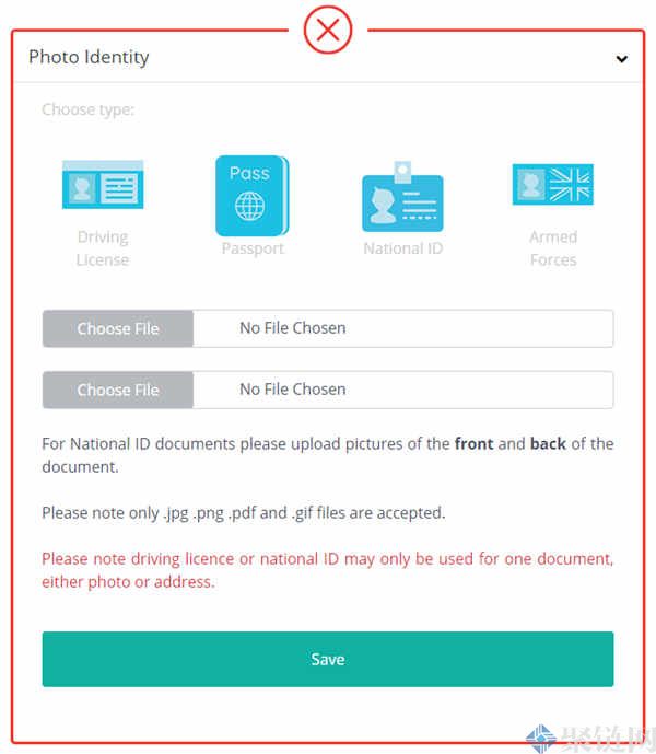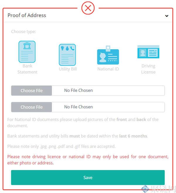 验证您的地址的过程是相同的。首先打开下拉列表,选择 您要上传的文档类型 ,然后单击“选择文件”上传。