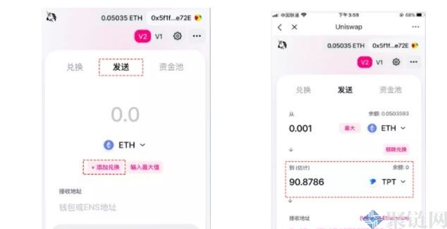 3、发送功能,既可以作为一个普通的代币转账工具,又可以实现从兑换到转账的功能。
