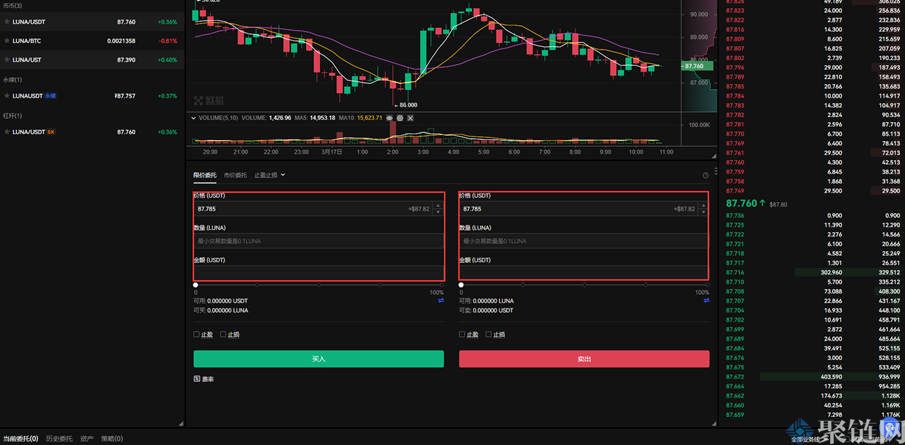 3、点击交易对后会出现交易界面,根据需求购买和交易LUNA币