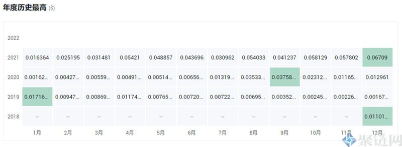 2022年1月18日MXC币出现历史最高价为0.090518美元,2021年12月MXC币出现最高价为0.06709美元,2020年9月MXC币出现最高价为0.03758美元,2019年1月MXC币出现最高价为0.01716美元,2018年12月MXC币出现最高价为0.01101美元。