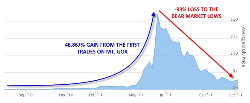第一周期(2010-2011年11月):价格从0.06刀飙升到29.38刀,上涨500倍,主要推动力是走出极客小群体后开始在Mt.