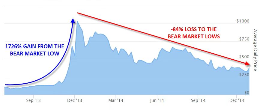 第三周期(2013年7月到2015年1月):2013年11月达到1200刀,主要推动力是中国政府支持比特币,后在政府改变主意禁止使用比特币后下跌84%。