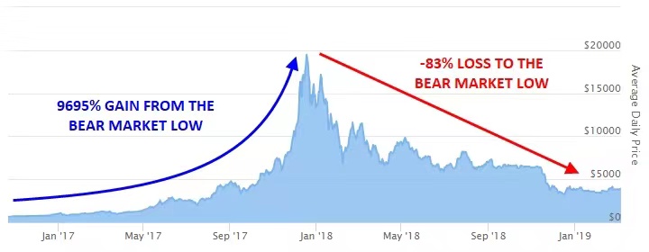 第四周期(2015年1月到2018年12月):2017年圣诞期间达到2万刀,主要推动力是越来越多商业开始接收比特币支付,其后下跌83%。