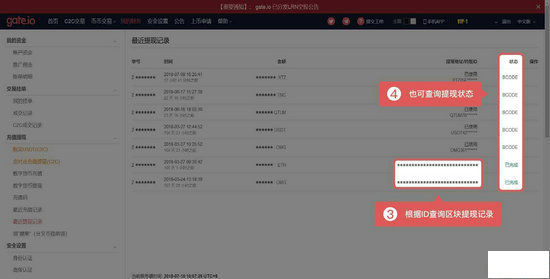 4、注意查询提现记录核实处理状态,发送成功如果没有收到,可以复制提现地址下面的交易ID联系接收方查询。